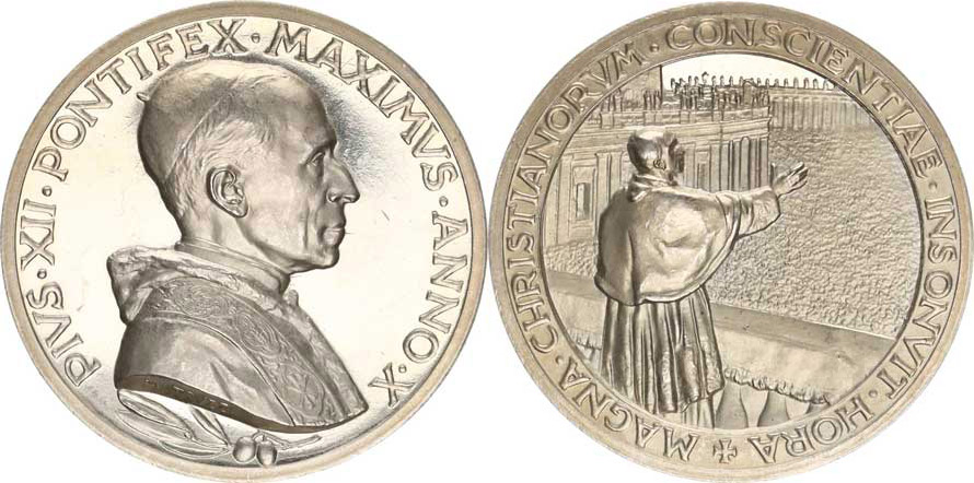 Pius XII., poprsí zprava, X. rok pontifikátu (1948) / Papež před zaplněným náměstím sv. Petra sign.: MISTRVZZI Ag 44 m m 35,562 g