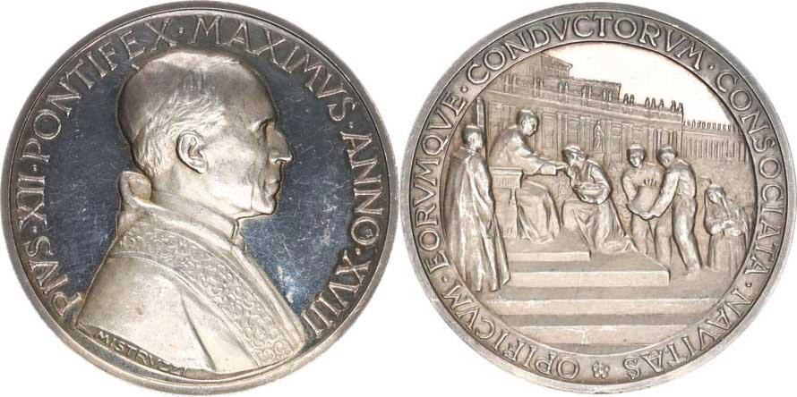 Pius XII., poprsí zprava, XVIII. rok pontifikátu (1956) / Papež p řijímá představitele Křesťanského sdružení italských pracujících sign.: MISTRVZZI Ag 44 mm 35,154 g