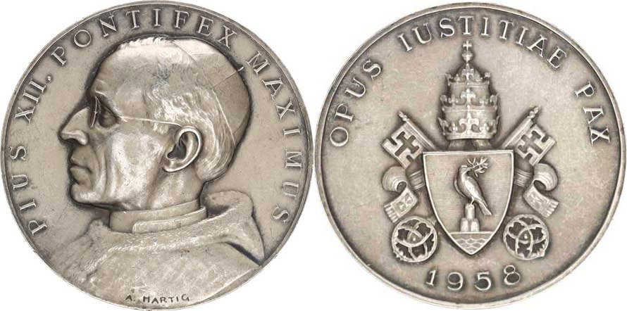 Pius XII. - Pontifex Maximus, poprsí zleva / Znak, opis: OPUS IUS TITIAE PAX sign.: A. Hartig Ag 925 punc na hr. 35,7 mm 24,98 g
