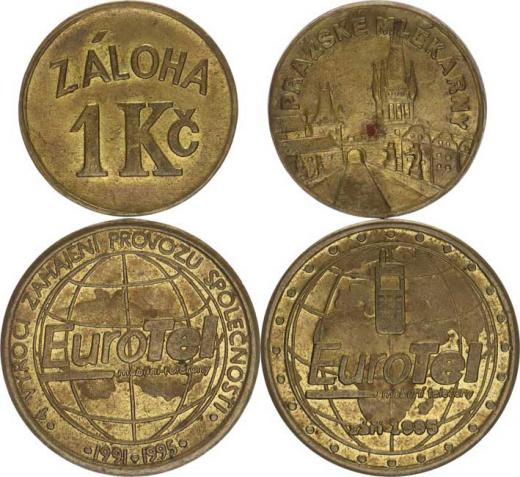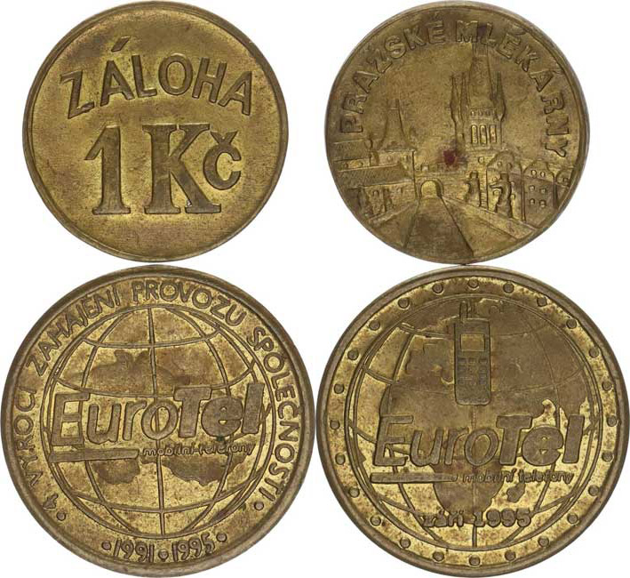 Pražské mlékárny, Karlův most / ZÁLOHA 1 Kč mosaz 25 mm 2/ EUROTEL - 4. výročí zahájení provozu společnosti 1991-1995 / M obilní telefony září 1995 mosaz 30 mm 2 ks