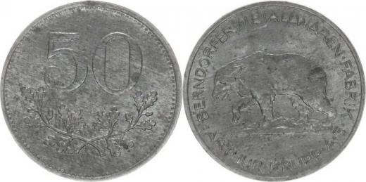 "50", hodnota nad dubovými větvičkami / Medvěd vlevo, opis: Berno rdfer Metalkwaren Fabrik - Arthur Krupp A.G. Zn 20 mm