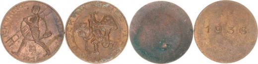 Novoročenka - "Glück im Neuen Jahr", Trpaslík s houbou a čtyřlíst kem / datace 1935 sign.: F. Placht Cu 23 mm 2/ "Glück ich Bringe 1936", Kráčející kominík vlevo sign.: J. Prinz Cu 23 mm 2 ks