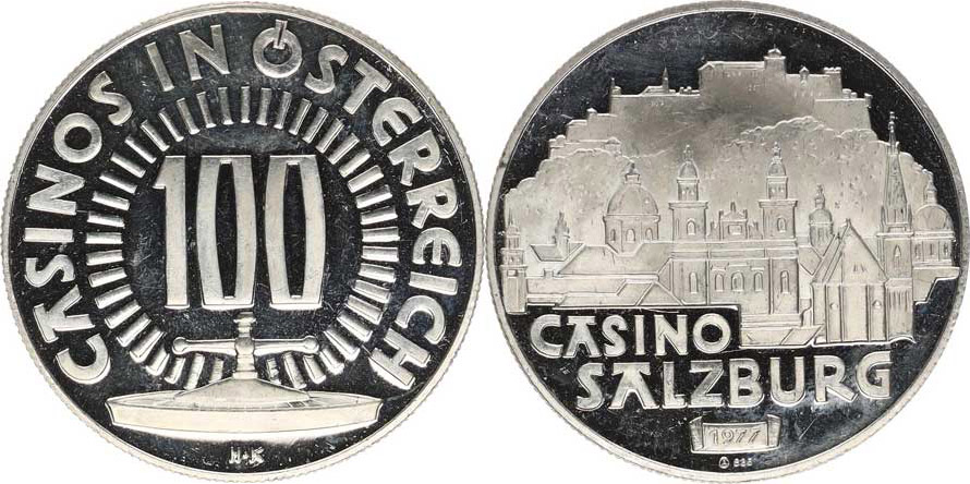 "100" Casinos in Österreich, styliz. ruleta / Casino Salzburg, do minanty města, ve stužce datace 1977 Ag punc 835 35 mm 15,78 8 g