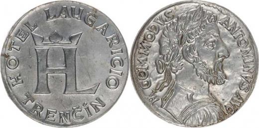 Trenčín - Hotel Laugaricio, znak a opis / Hlava císaře Commoda zp rava Al 28 mm
