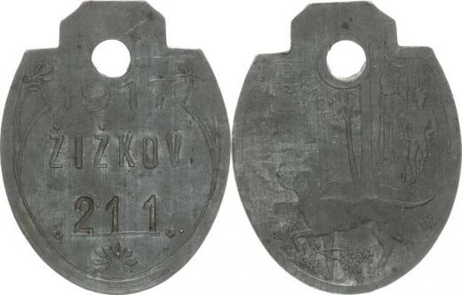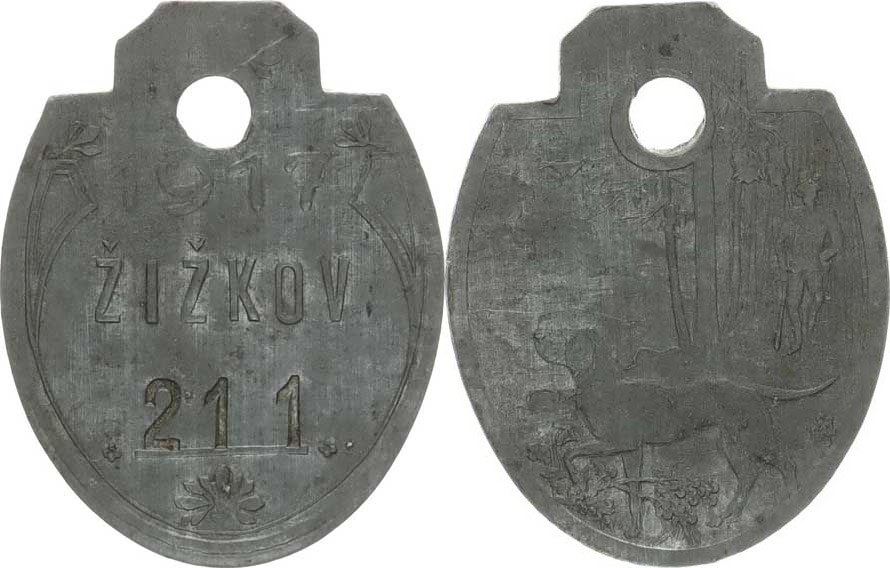 Žižkov - 1917 - číslo 211 / Lovecký pes s myslivcem v krajině Zn 28x36 mm