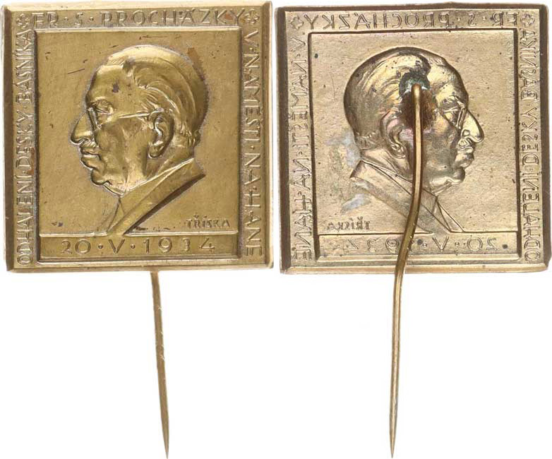 Náměšť na Hané - Odhalení desky básníka Fr. S. Procházky 20.V. 19 34, Hlava vlevo sign.: Tříska zlac. plech 28x28 mm jehla