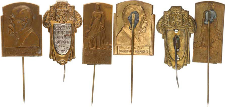 Radhošť - Jubilejní národní slavnost 1862-1922 mosaz plech se vsazeným bílým středem 20x35 mm jehla; +2/ Místek - Jubilejní výstava Moravsko-slezského pobezkydí 13.-15.VII. 1926 plech 17x3 5 mm jehla; +3/ Vsacko - presidentu Masarykovi sign.: E Hlavica 24 bronz 23x30,5 mm jehla 3 ks