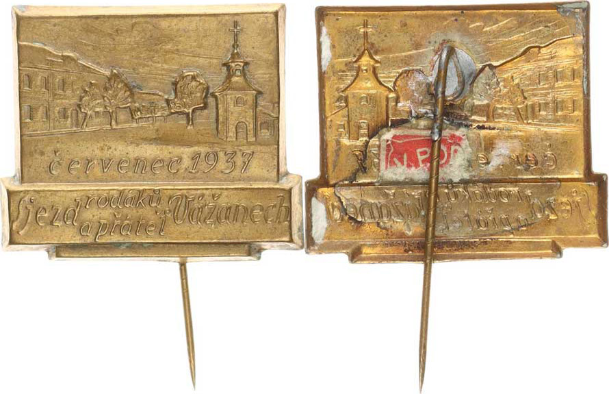 Vážany - Sjezd rodáků a přátel - červenec 1937, Náves s kapličkou zlacený plech 33x27 mm jehla