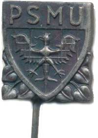 "P S M U" (Pěvevké sdružení moravských učitelů) - klopový odznak postř. kov 15x17 mm jehlice