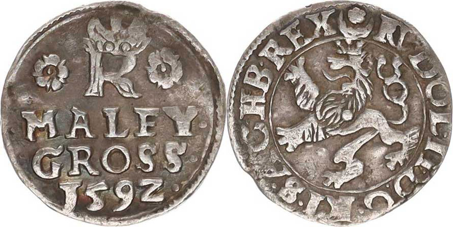 Malý groš 1592, Jáchymov-Hoffmann HN 8b/7c, všude tečky / bez tečky za REX 0,898 g