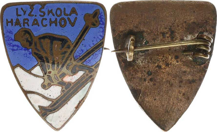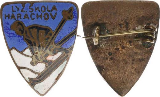 Harachov - Lyž. škola barevný smalt, tvar štítu 18x22 mm zapí n. sponka