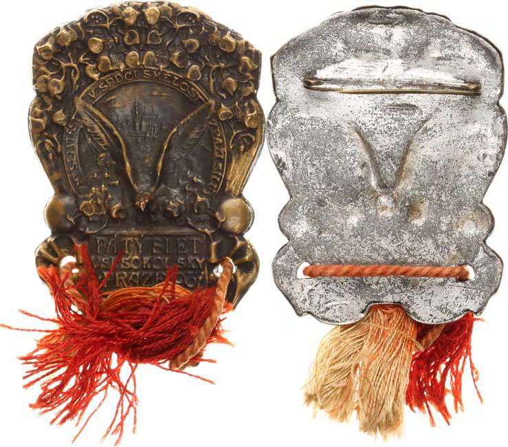 V. slet všesokolský v Praze 1907 - Slavnostní sletový odznak bronz 42x56 mm s dvoubarev. šňůrkou s třásněmi Nov. V. O1. c