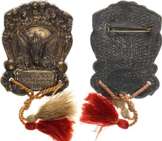 V. slet všesokolský v Praze 1907 - Slavnostní sletový odznak v Rv.: vyrobeno L. Očenášek v Praze II. bronz 42x56 mm s dvoubarev. šňůrkou s třásněmi Nov. V. O1. c