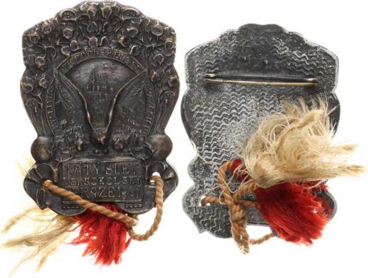 Pátý slet všesokolský v Praze 1907, V MYSLI VLAST... Zn 42x60 mm masívní 2x dír. s provleč. červ. -bíl. střapci