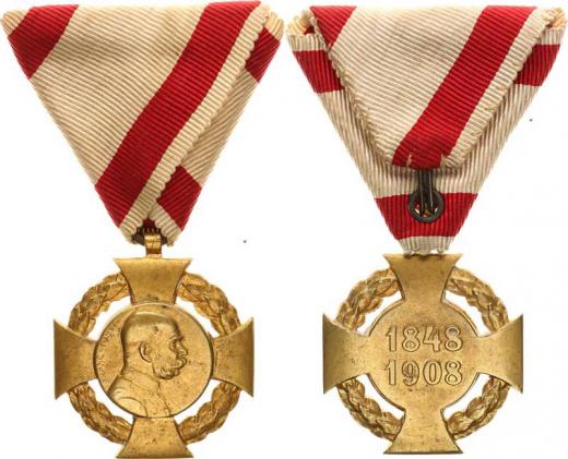 Jubilejní kříž z r. 1908 na vojenské stuze bronz zlacená VM I/37a; Marko.402a