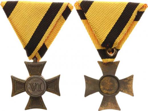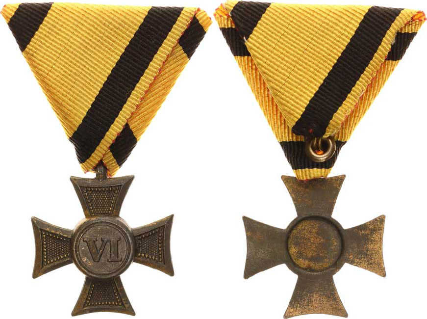 Vojenský služební kříž 3. tř. pro poddůstojníky za "VI" let, kříž bronz, hladký střed věnce VM 2-8/1913 F var.