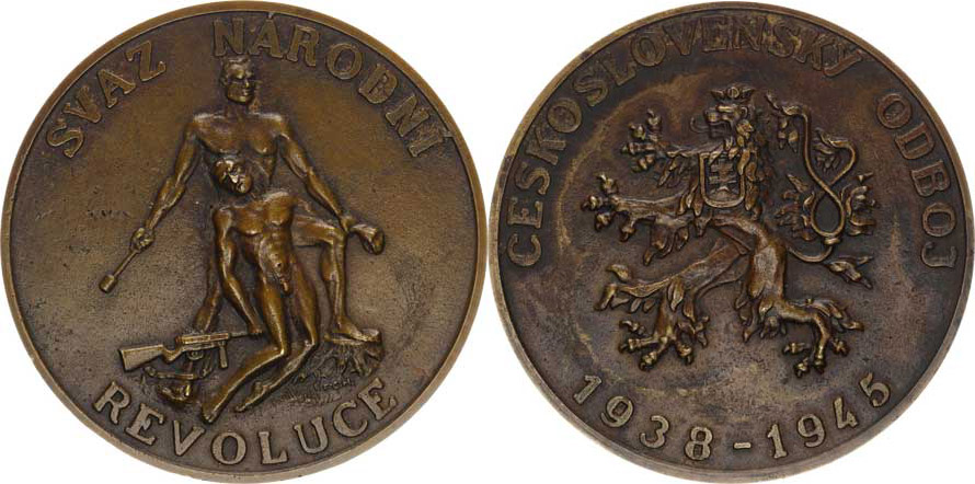 Plaketa "Československý odboj 1938-1945", znak / Svaz národní rev oluce, alegorie sign.: F.CIM bronz 76 mm