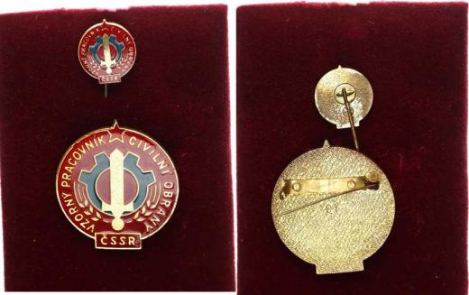 Odznak "Vzorný pracovník civilní obrany ČSSR" barev. smalt. moosaz 38 mm + klopová miniatura 17 mm 2 ks v orig. etui