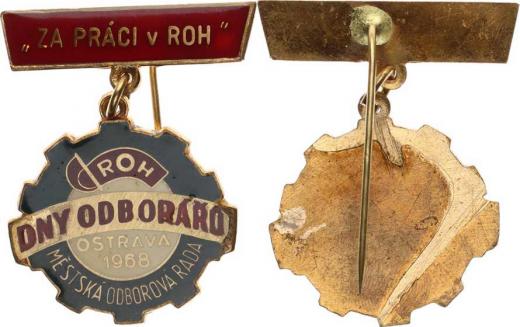 ROH "Za práci v ROH" - Dny odborářů Ostrava 1968, Městská odborov á rada barevný smalt. odznak s kovovým štítkem orig. etue