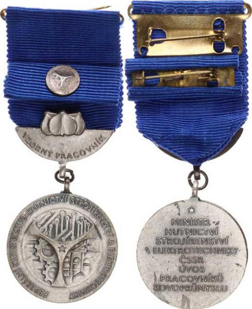 Pam.medaile "Vzorný pracovník" Federální ministerstvo hutnictví, strojírenství a elektrotechniky / Ministr hutnictví....... ČSSR Ú VOS pracovníků kovoprůmyslu bronz postř. 30,5 mm se stuhou + malá nápsní stzžka orig. etue