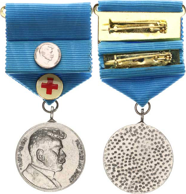 Vyznamenání ČSČK "Jánského medaile" stříbrná, na modré stuze, na stuze smalt znak ČK + malá stužka s miniaturou