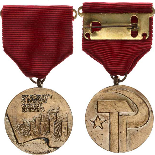 Pam.medaile "Za zásluhy o rozvoj okresu Karviná" sign.: Ciencia la-Moldřík bronz 30 mm na vínové stuze etue