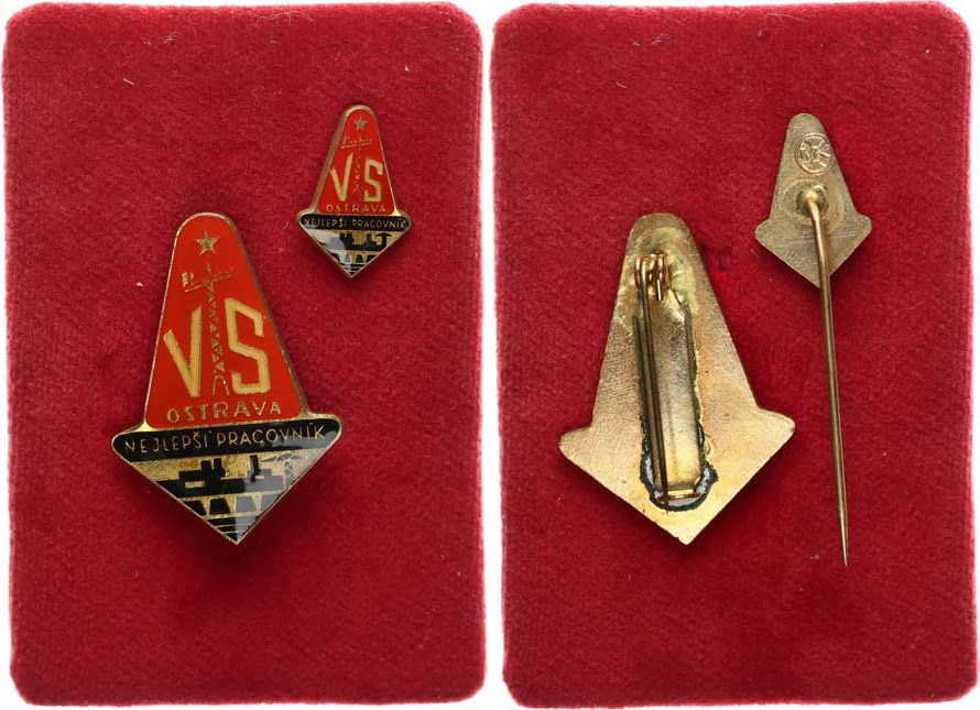 Odznak "Nejlepší pracovník VS Ostrava" (Vítkovické stavby) mnoho barev. mosaz, 2 ks velký se sponou +malý klopový orig. etue
