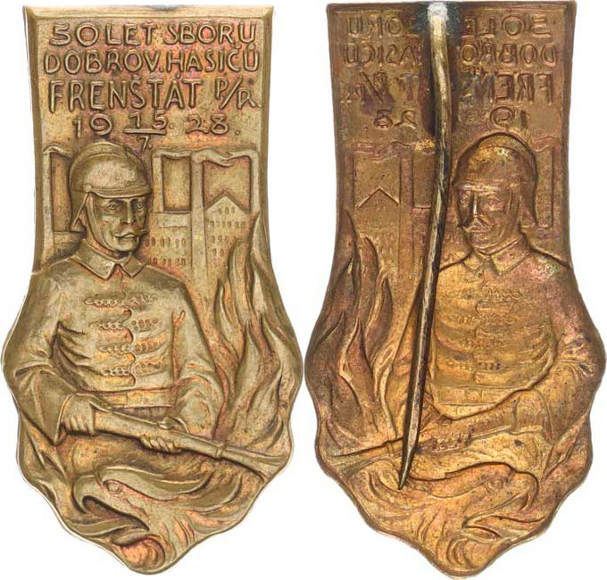 Frenštát pod Radhoštěm - 50 let sboru dobrov. hasičů 15.7. 1928 bronz. plech 23x45 mm jehla