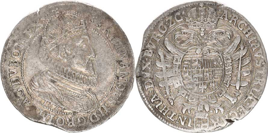 Tolar 1621, Korutany Klagenfurt jako Voglhub.139/II ale data ce pod poprsím, opis: G. HV. BO. REX. / pod korunou jablko s kříž kem Her. 453 a 27,733 g +podlož. štítek fy. Herinek "RR" _vada stř. na hraně, mír. kraj. stř.