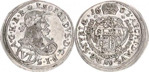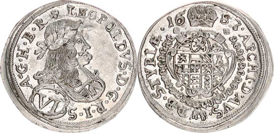 VI kr. 1683 I A N, Štýrsko,Graz-Nowak - typ oboustr. bez vnitřníc h kruhů, nad hlavou květinka, opis: LEOPOLDVS. D.G.R.I.S - A.G.H. B.R / .ARCHID.AVS. - D.B.STXRIAE. - úzká 3 v dataci "sbírkový stav" 3,591 g