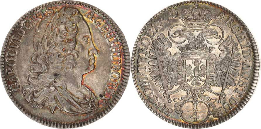 1/4 Tolar 1740, Tyroly, Hall opis: ARCHID: AUST: DUX. - .BU: COM . TYROL. 7,006 g