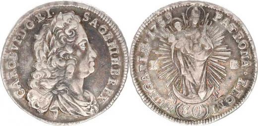 30 kr. 1739 KB "R" Husz. 1625_nep. just., patina, tém.