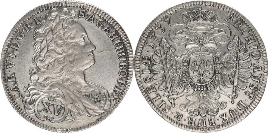 XV kr. 1737 b.zn., Vratislav MKČ 1914 var.: GE. HI. HU. / AU ST. DUX. BUR. &. SILESIAE. 6,332 g "R"