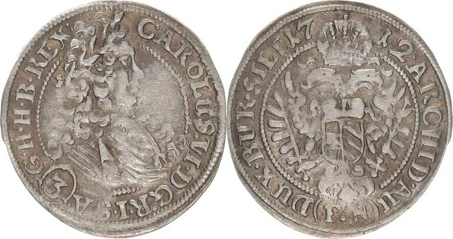 3 kr. 1712 FN, Vratislav-Nowak MKČ 1925 var.: R. I. S. A.() G. H. H. / BUR. SILE 17 - hranatý prsní štítek_mělčí ražba, tém.