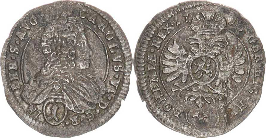 1 kr. 1715, Kutná Hora-Wohnsiedler "RR" jako MKČ 1689, ale opis: S. AVG. 0,769 g_patina, tém.