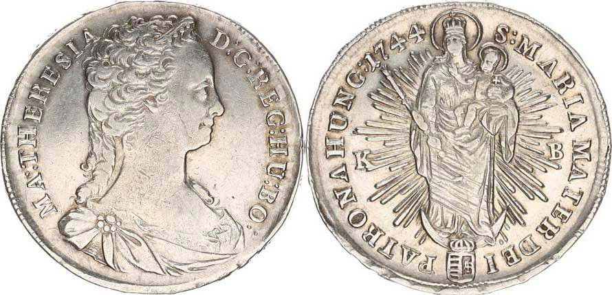 1/2 Tolar 1744 K-B, Kremnica typ: REG: HU: Husz. 1683 var.: bez tečky za THERESIA 14,258 g "R"_mír. just.