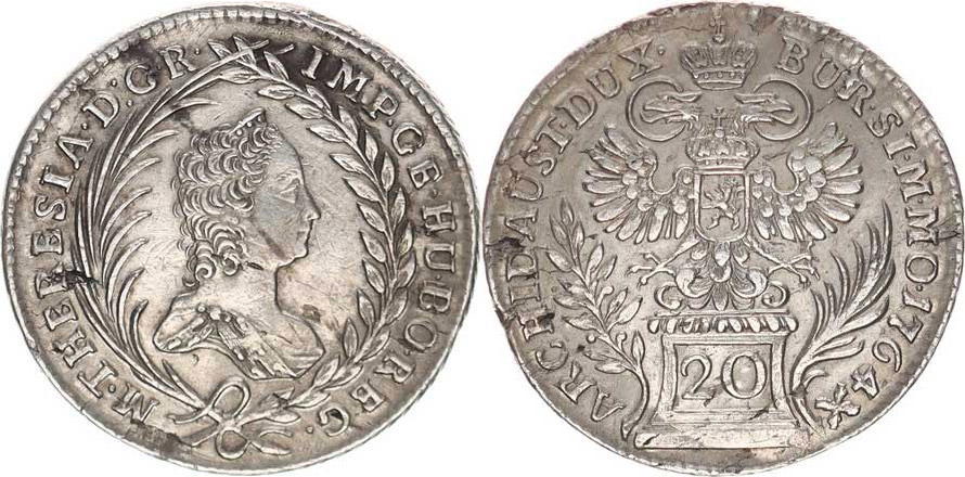 20 kr. 1764 b.zn, Praha-Erdmann MKČ 1950 _dr. vada stř., hr.