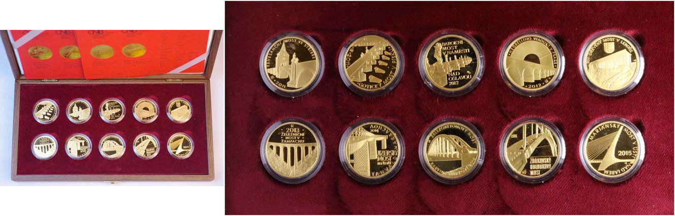 10 x 5 000 Kč - Sada "Mosty České republiky", kapsle, luxusní d řevěná etue +certifikáty