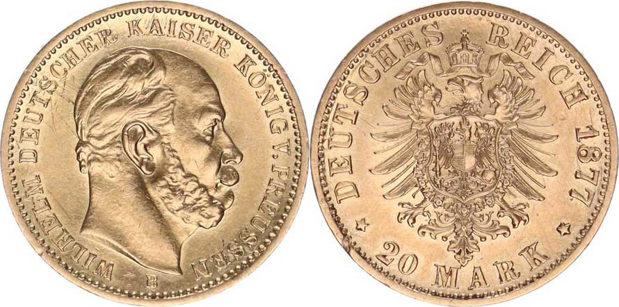 20 Mark 1877 B J. 246; KM 505 7,916 g _rys. za hlavou, dr. hr.