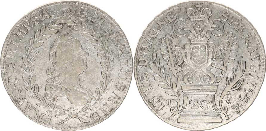 20 kr. 1754 H-A, Tyroly Hall var.: zn. H ražená jako dvě I I _mír. just.
