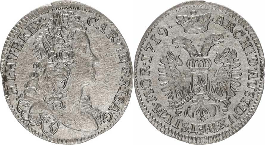 3 kr. 1719 b.zn., Praha-Scharff MKČ 1834 var.: za datací te čka 1,334 g