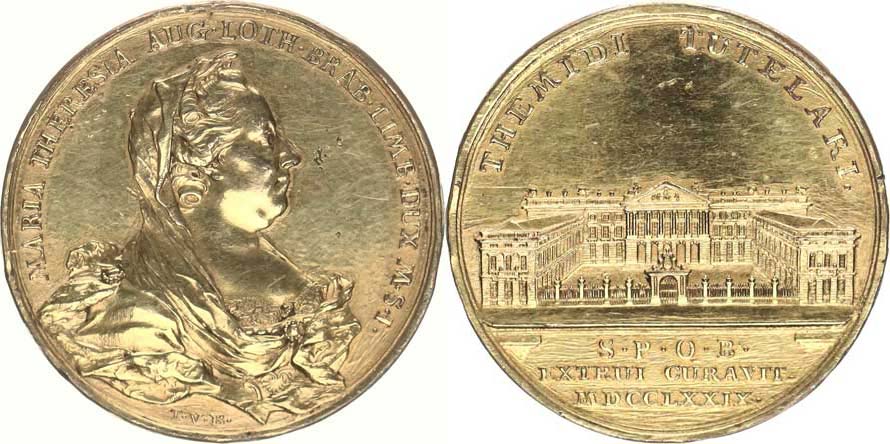 Medaile 1779, Na výstavbu justičního paláce v Bruselu - poprsí zp rava, opis / budova, opis a nápis sign.: T.v.B. (T. van Bercke l) zlacen. bronz 33 mm 15,737 g Monten. 2088(AR);