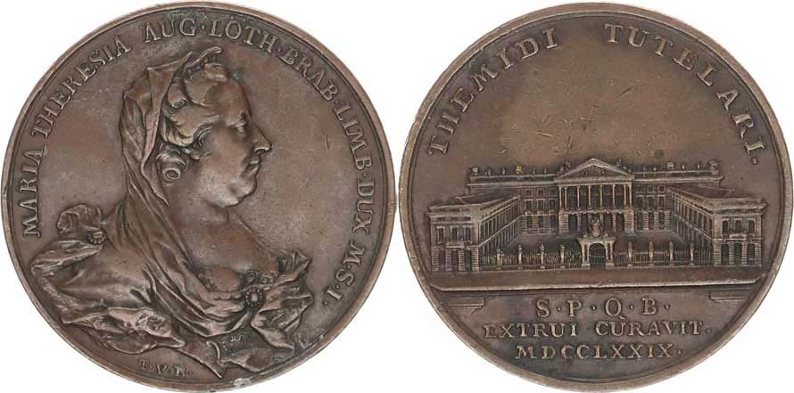 Medaile 1779, Na výstavbu justičního paláce v Bruselu - poprsí zp rava, opis / budova, opis a nápis sign.: T.v.B. (T. van Bercke l) bronz 33 mm 15,332 g Monten. 2088(AR); H. 2983(AR)