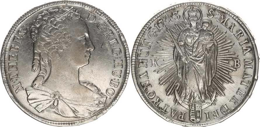 Tolar 1743 K-B, Kremnica typ: M: THERES: ....HV:BO. - dva pramen y vlasů Husz. 1668 28,537 g
