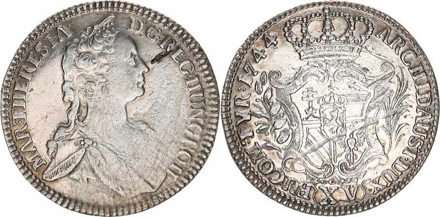 XV kr. 1744 b.zn., Praha "RR" 6,23 g _dr. just. a vada stř. v Av., škrt. v Rv., jinak