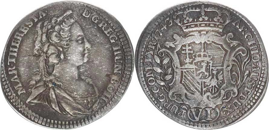 VI kr. 1743 b.zn., Praha-Scharff "RRR" jako MKČ 1965, tečka za THERESIA. - . D: G: REG: HUN: BOH: