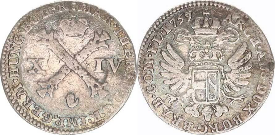 Plaquette (XIV Liards) 1757 zn. ruka, Antverpy "R" 2,289 g _hr.