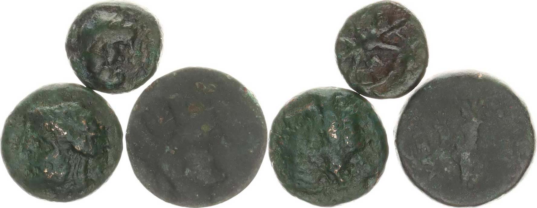 Konvolut 3 ks: AE 12 - Vousatá hlava / ještěrka AE 14 - Mužská hlava / ženská hlava; +AE 17 - hlava Tyché s hrad ební korunou / stoj. postava drží Niké