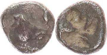 AR hemiobol (1/2 obolu) 0,32 g; A: hlava koně ? / kvadratum incu sum