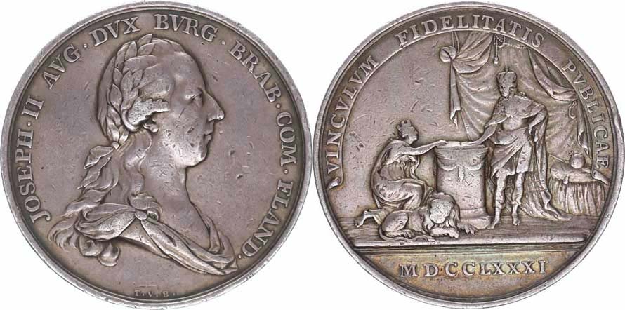 Medaile 1781, na holdování v Belgii 1781, Portrét Josefa II. zpra va, opis / Císař stojí před trůnem a přijímá od Belgie klečící u oltáře hold, opis, dole v úseči letopočet sign.: T.V.B.Ag 46,2 mm 25,418 g Novák XV-H-2b, Montenuovo 2138_hr., rysky